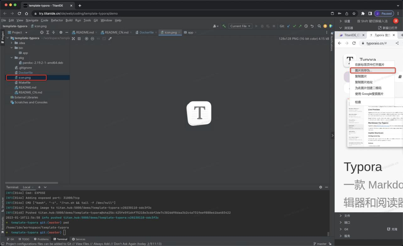下载 Typora 的应用图标,在内置浏览器打开 Typora 官网选择 Typora 的 Logo,点击另存为到 /home/ide/workspace/template-typora 下面,保存的文件名为 icon.png,在接下来的镜像构建步骤中, TitanIDE 会将这个图标打包到镜像里面,Dockerfile 里面必须有以下两行: